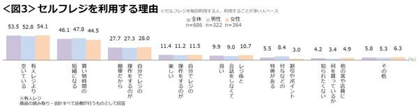 ●セルフレジを利用する理由としては【有人レジより空いている】が5割以上で最多。次いで【買い物時間の短縮になる】【自分でレジの操作をするのが簡単だから】となった。<図3>
