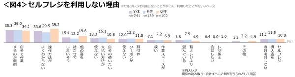 ●セルフレジを利用しない理由で最も多かったのは【自分で作業するのが面倒】となった。性別では、男性は自分が使いたい支払い方法が使えないこと、女性は操作方法がよくわからないことや他の客を待たせてしまいそうなことがネックとなっている様子。<図4>