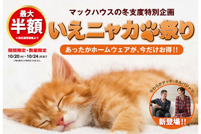 2016年10月19日 17:00 この度、株式会社マックハウス(本社:東京都杉並区/代表取締役社長:白土 孝)は、「いえニャカ祭り」と題し、あったかホームウェアを驚きの価格でご提案いたします。