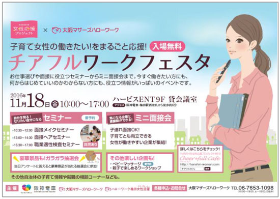 2016年10月19日 17:45阪神電気鉄道株式会社(大阪市福島区、社長:藤原崇起)は、大阪マザーズハローワーク(大阪市中央区)と共同で、主に子育て中の女性を対象として、11月18日(金)に大阪梅田のハービスENTで、仕事と子育ての両立を支援するイベント「チアフルワークフェスタ」を開催します。