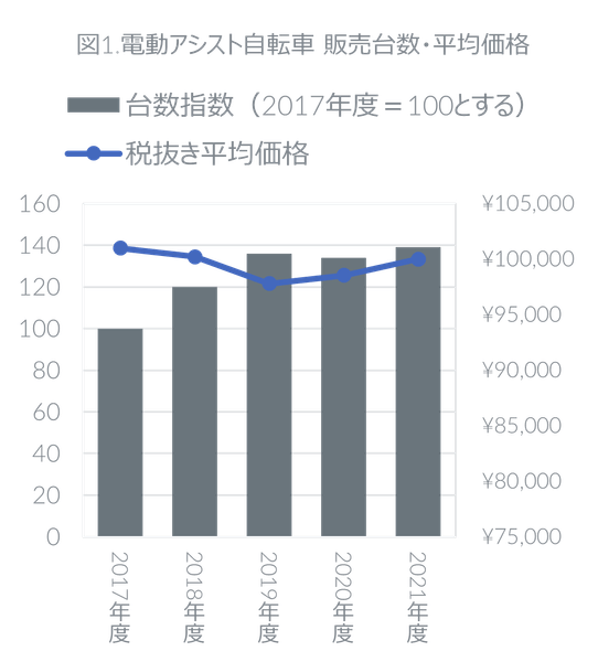 電動アシスト自転車の平均価格は上昇傾向にあり、2021年度の税抜き平均価格は100,001円と前年度から1%上昇した。特にホーム車、ミニサイクルの価格が上昇しており、ホーム車は104,177円と2%、ミニサイクルは92,450円と2%それぞれ前年度から上昇した。その結果、販売金額は前年比5%増と堅調であった。