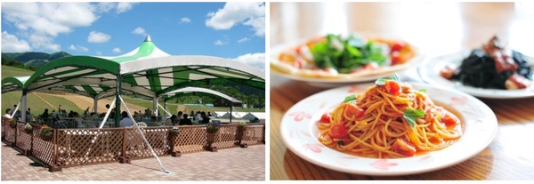 屋外の大型テント会場、「バーベキューガーデン」は、最大 350 席。食材は全て用意してあり、事前準備不要。手ぶらで気軽にバーベキューが楽しめます。また、ホテルハーヴェストスキージャム勝山では「ラウンジ伊炉里」で、ホテルの料理人が手掛ける上質なイタリアンランチを堪能できます。屋外テラス席も備えており、目の前に緑が広がる開放的なテーブルで、ペットと一緒にランチタイムを過ごすことができます。