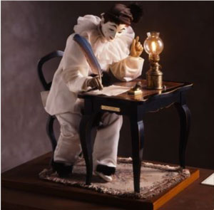 エクリヴァン(自動人形)手紙を書く仕草をするピエロが居眠りをします。再び目覚めた後、消えかけたランプに火を灯し直して、手紙を書く仕草を続けます。企画展「からくり人形~西洋と日本~」概要