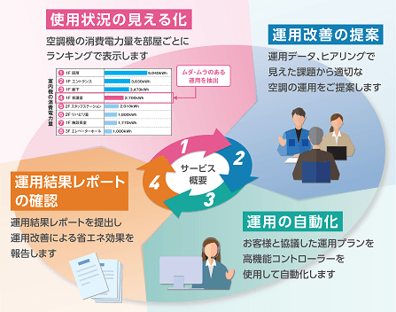 空調機を遠隔監視し、①使用状況の見える化 ②運用改善の提案 ③運用の自動化 ④運用レポートの報告、という4つのサイクルを回すことで、お客様の継続的な省エネ活動をサポートします。①使用状況の見える化では、消費電力量を室内機ごとにランキング化し、運用改善が見込める室内機を割り出します。②運用改善の提案では、空調データとお客様への利用状況のヒアリングを基に最適な改善策を提案します。③運用の自動化では、ユーザーと協議して決定した運用スケジュールを高機能コントローラで設定し自動化します。④運用レポートの報告では、運用改善による省エネ効果をレポートとして提出するとともに、更なる省エネに向けた具体的な改善策を提案します。