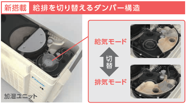 従来の『うるさらX』は、室外機の上に搭載した加湿換気ユニットと専用の換気ホースを使って屋外の空気を室内に送り込む給気換気機能が特長でした。本商品では新たにお部屋の空気を外に出す排気換気機能を搭載しました。加湿換気ユニット内部にはダンパー構造を設けており、お客様の生活シーンに合わせて給気と排気を切り替えることが可能です。夏場は室内の温度が屋外より高い場合に排気換気を行い、熱気の排出後には自動で給気換気に切り替える機能も搭載しました。冷暖房しながら換気することで室温を維持できるため、快適性と省エネ性が両立できます。