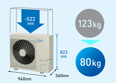 ファンの徹底的な改良と、熱交換器の冷媒偏流抑制による高効率化で、室外機を大幅にコンパクト化することができました。業界最小かつ最軽量の室外機(製品高さ823mm、製品重量80kg)となり、生産搬入及び廃棄時など、製品のライフサイクル全体を通して環境負荷低減に貢献します。
