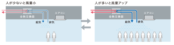 外気の導入による熱負荷は空調負荷の約1/3を占めており、過剰な換気は消費エネルギーの増大につながります。「TB-SQUARE osaka」ではオープン当初より、排気時に放出する空調エネルギーの回収が行える全熱交換器を導入し、空調負荷の軽減に取り組んできましたが、当社が行った現地調査では、ショールームへの来客者数が日によって大きく変動するにもかかわらず、全熱交換器が一律に運用されていることが判明しました。そこでCO2センサーを新たに導入して人の混み具合を検知し、全熱交換器との連動制御を行いました。来客者数に応じて換気量が最適化されたことで大幅な省エネを実現できました。