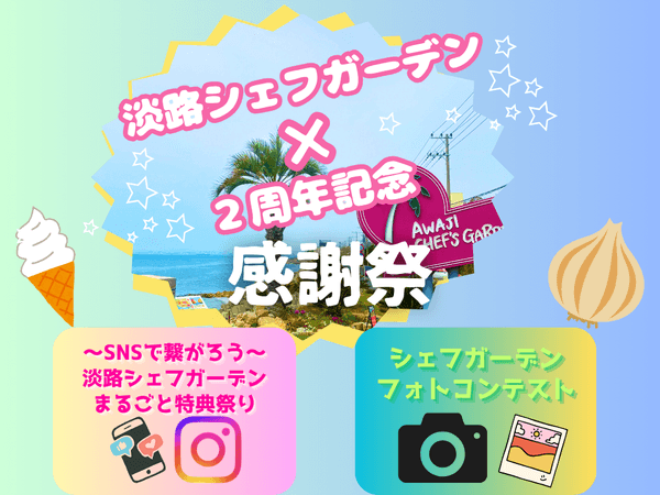 さらに、施設内で撮影した写真に、ハッシュタグ「#淡路シェフガーデン」「#2周年」を付けて、Instagramへ投稿いただいた方の中から、抽選で15名様に淡路島産玉ねぎ10㎏が当たるフォトコンテストも実施。