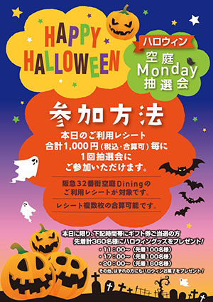 2016年10月28日 16:45大阪梅田にある阪急32番街空庭ダイニングでは、10月31日(月)にハロウィン空庭Monday抽選会を実施いたします。