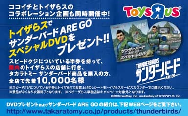 さらに、スピードクジについている半券“チャレンジ券”を持って国内のトイザらスでタカラトミーのサンダーバード 商品を購入した方先着合計10,000名様に、当社制作の「サンダーバード ARE GOスペシャルDVD」をプレゼントします。(なくなり次第終了。 ベビーザらス単独店は除く )