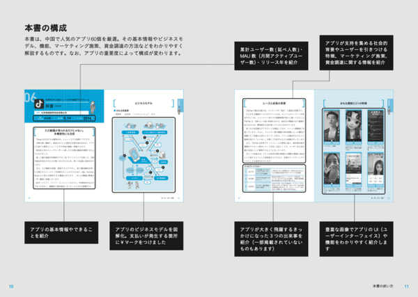 本書は世界屈指のオンライン大国、中国で人気のアプリ60個を厳選。そのビジネスモデルや機能、インターフェイス、マーケティング施策、資金調達などのさまざまな情報を図解や画像を交えながらわかりやすく解説していきます。