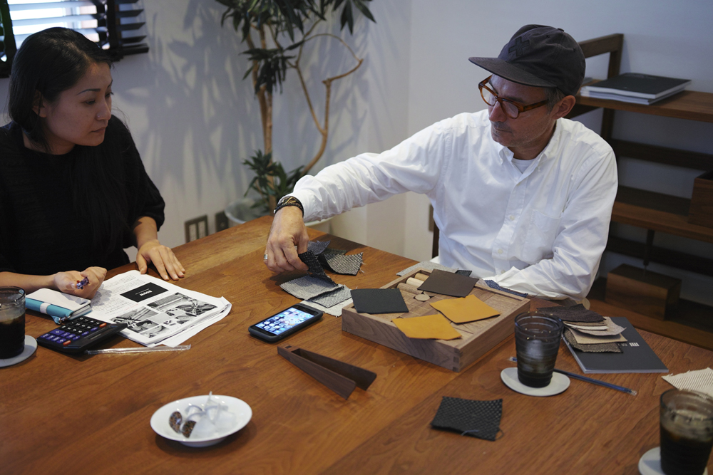 まずは当社スタッフと共に、明治30年創業の老舗帽子メーカー石田製帽(岡山県笠岡市)を訪れ、縫製等の作業場を視察。海外でも注目されているという美しい縫製技術にWalker氏も強く関心を持たれていました。訪問後はアカセ木工本社に移動し、ウォールナット材の選定、加工から組み立て、仕上げまで一連の製造工程をご案内しました。工場見学を待望していたWalker氏からは、加工の道具や作り方について積極的に質問が飛び、終始和やかな雰囲気の中で見学が行われました。見学後はソファ等で使用する生地サンプルのチェック、ブランドのコンセプトや商品についてディスカッションしました。