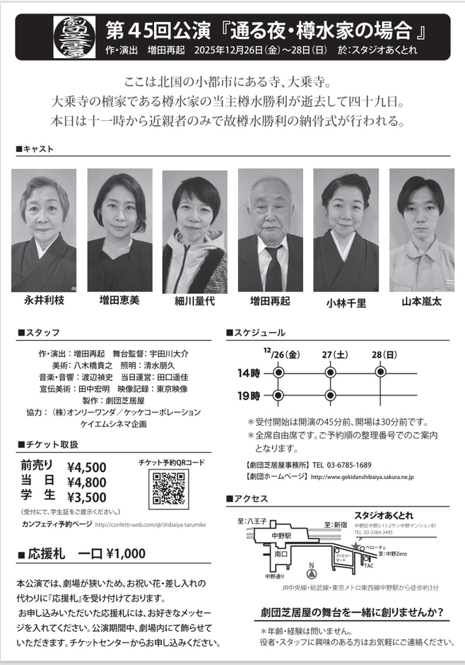 劇団芝居屋第45回公演『通る夜・樽水家の場合』が2025年12月26日 (金) 〜 2025年12月28日 (日)に中野スタジオあくとれ(東京都 中野区 中野 2丁目11-2 サン中野マンションB1)にて上演されます。