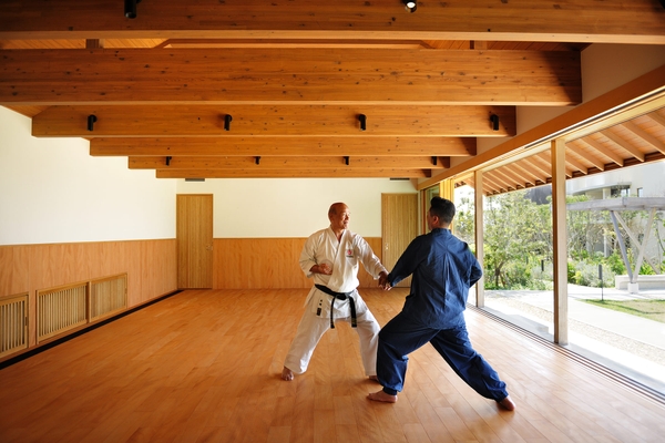 敷地内にある道場は、赤瓦の屋根に開放的な窓、縁側を備えた平屋の建物です。滞在中のお客様が集い、時に身体を動かし、時におしゃべりを楽しめるように、さまざまなアクティビティを行っています。道場の窓を開けると、正面には気持ちのよい芝生が広がり、その奥には海が見えます。当プログラムで唐手の稽古と動禅瞑想を行う際は、この道場を貸し切り、体験に集中できる環境を整えています。