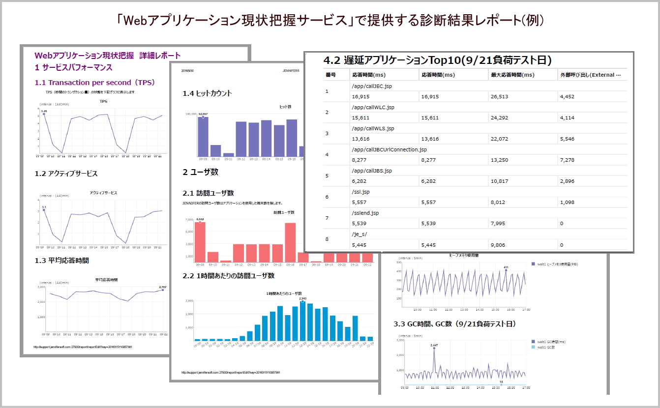 今回、提供を開始する無償の「Webアプリケーション現状把握サービス」は、JENNIFERを用いて顧客企業のWebアプリケーション環境のモニタリングを2週間実施し、レスポンスの遅延箇所、リソースの負荷状況、現状の問題点や懸念点を見える化するサービスです。複雑化あるいはブラックボックス化しがちなWebアプリケーションの内部処理や問題点を診断結果レポートとして提示し、Webアプリケーションの遅延箇所の解消や品質改善につなげます。