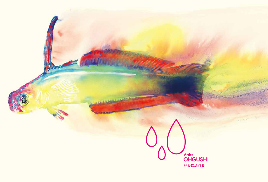 ニフレルの1つめのゾーン「いろにふれる」は、空間全体が色彩変化するインスタレーションと共に、生きものたちの色の多様性を表現しています。ここでは、水彩画アーティストのOHGUSHIさんが、小さな魚達の目が覚めるような発色や細部の美しさを、<いろ>あざやかな、水彩技法で表現します。
