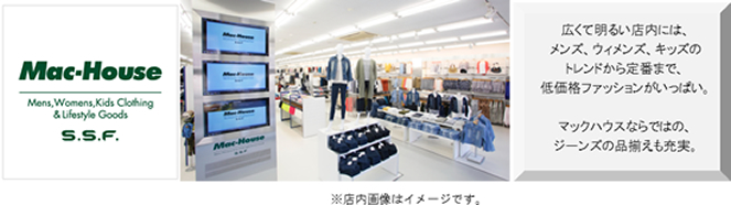 『マックハウス スーパーストアフューチャー』 11月12日(土) 佐賀県に初上陸『マックハウス スーパーストアフューチャー』は、プライベートブランドを中心に、カジュアルウェアからビジカジ、ハイセンスなトレンドファッションから、実用的なインナーレッグウェアや雑貨まで、幅広い品揃えで展開する新コンセプト・カジュアルショップです。