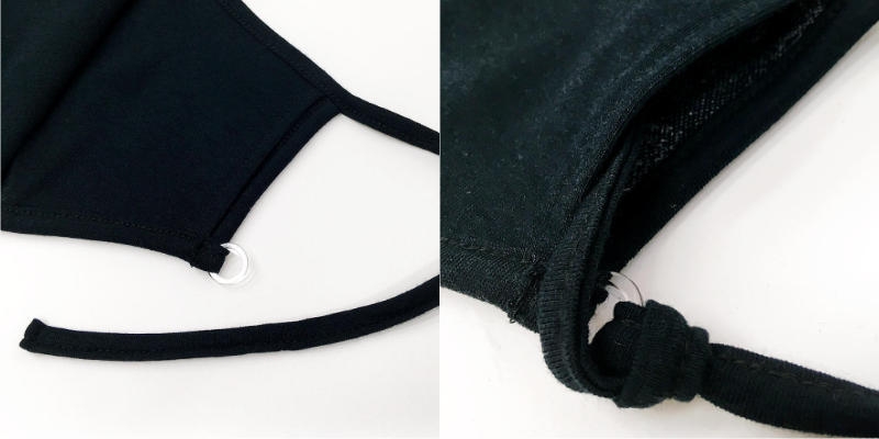 耳掛けの取り付け部分にサイズ調整用のリングを付け、耳掛けのひもを結ぶことでサイズ調整ができ、結んだひもの先はマスクのポケット部分へしまい込むことが可能。