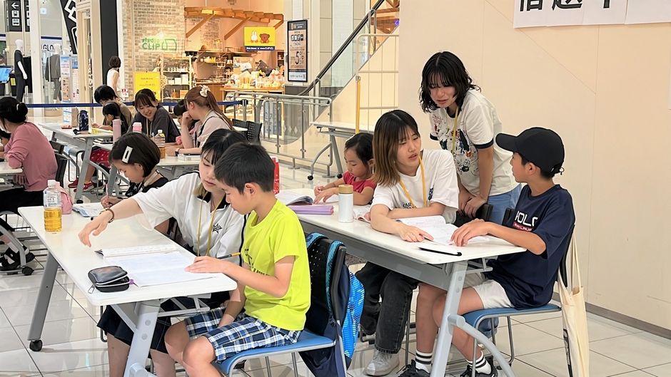 人間学部髙橋香苗ゼミの学生を中心に人間学部の有志の学生13名が8月15日、イオンモールナゴヤドーム前店で地域の小学生の学習支援「夏休み・宿題サポート隊!」を初めて開催しました。当日はマスコミの取材も複数入るなど、大盛況でした。