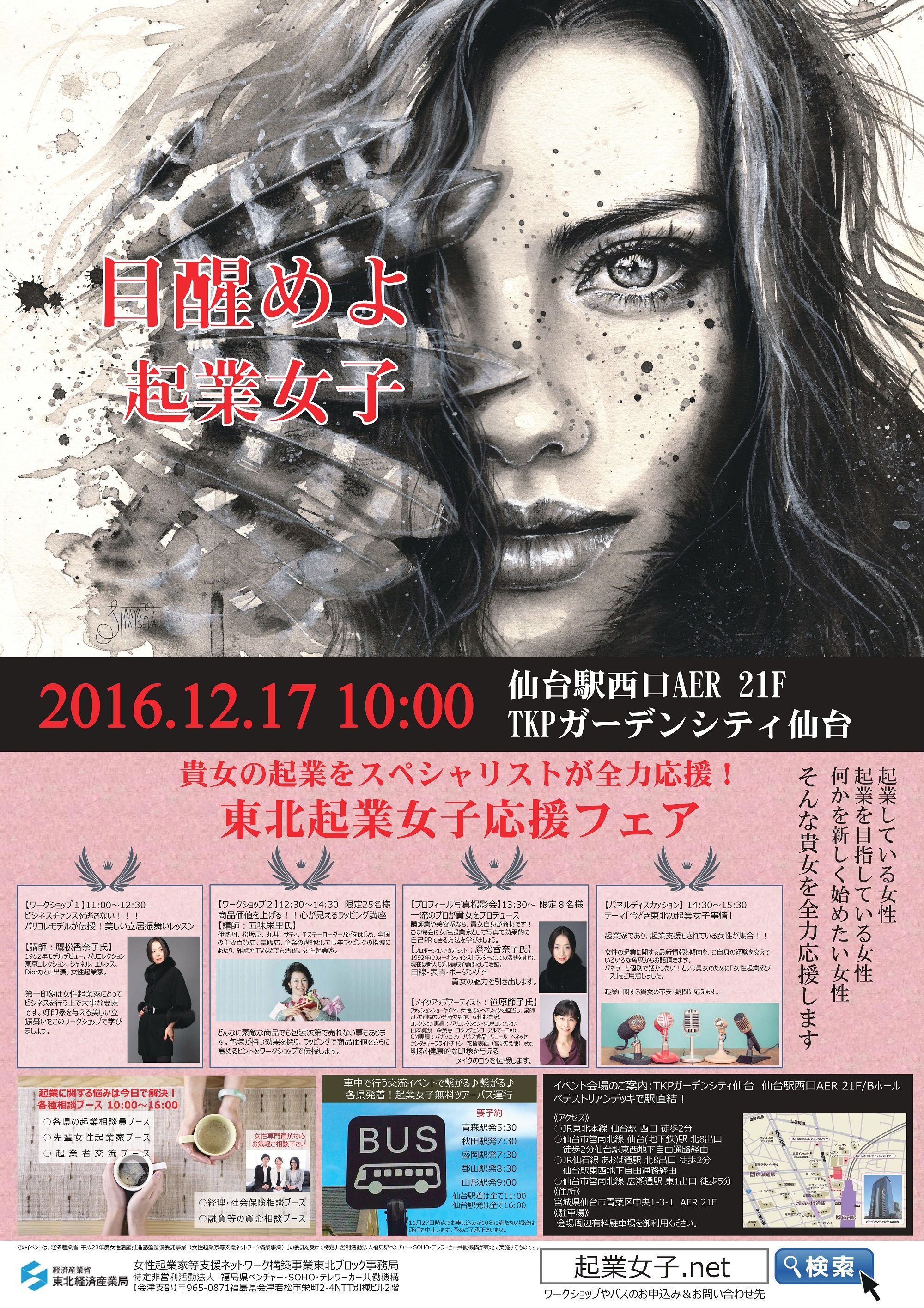 東北起業女子応援フェア ポスター本イベントでは、起業したい女性や女性起業家を対象に、パリコレモデルが伝授する所作や有名講師によるラッピング、プロフィール写真撮影会など、各分野のスペシャリストによる魅力的なワークショップや相談ブースなど女性起業家目線のイベントを用意しています。