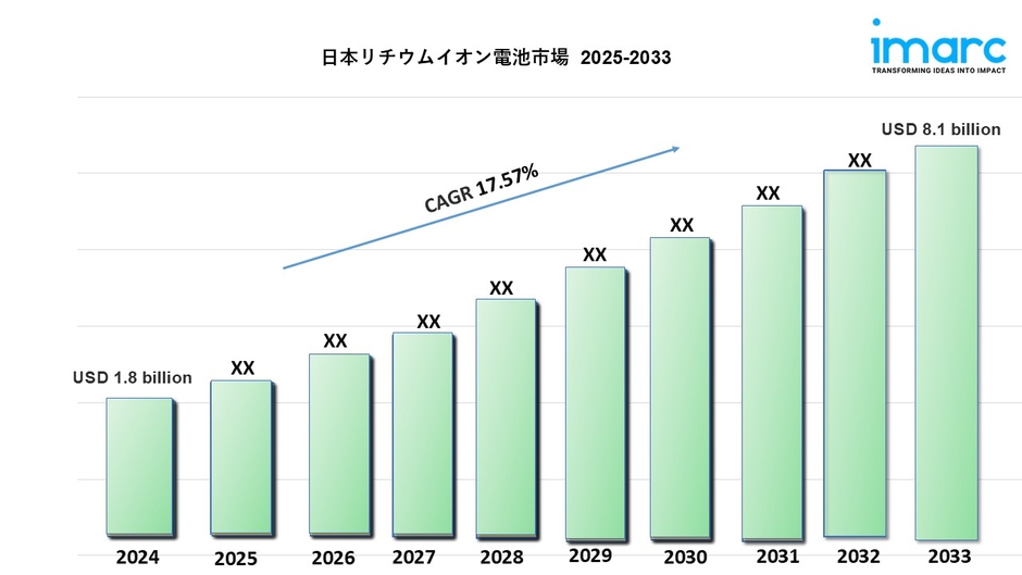 IMARCグループによると、日本のリチウムイオン電池の市場規模は2024年に18億米ドルに達しました。今後、IMARCグループは、2025年から2033年の間に年平均成長率(CAGR)17.57%を示し、2033年までに市場が81億米ドルに達すると予測しています。