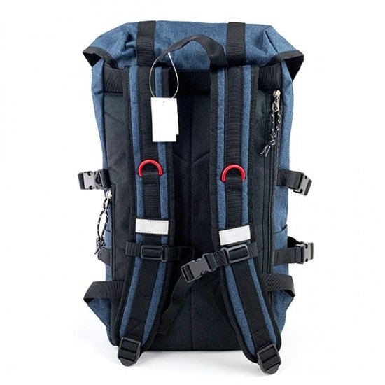 こちらは、デザインが少し違うタイプです。カラーはネイビーで、収納力もアップしています。バックル遣いもあちこちに見られて、リュックらしさがプラスされていますよね。
