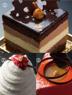 ブラウニー生地の上に、ブラック・ミルク・ホワイトの3層のムースをのせ、チョコレートのグラサージュで仕上げました。