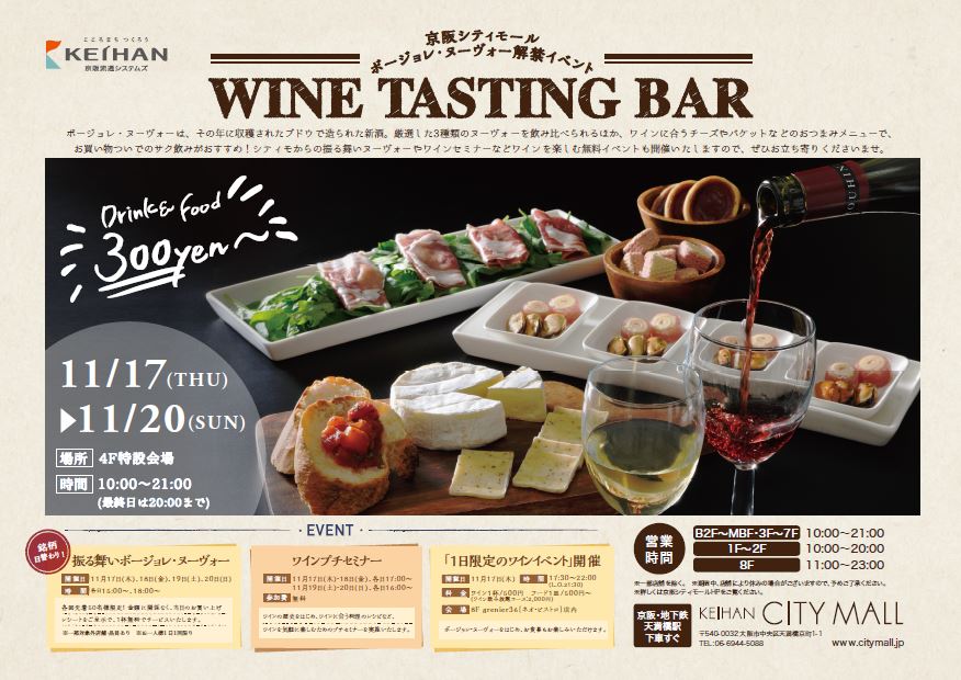 京阪シティモール・KUZUHA MALLにて 「ボージョレ・ヌーヴォー」イベントを開催! ワインセミナー等参加型企画も