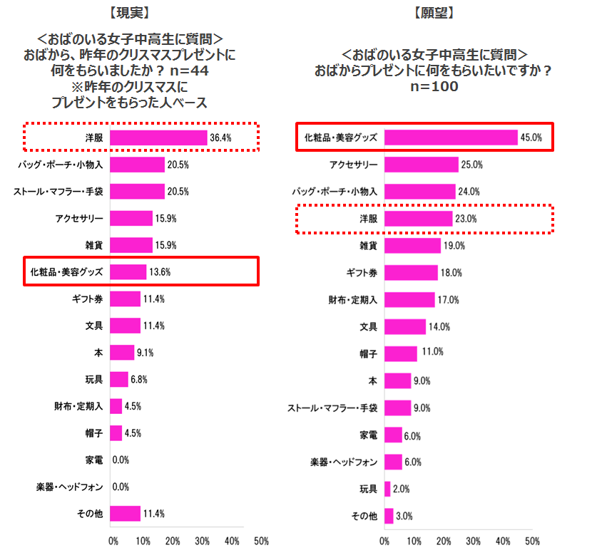 一方で、「昨年のクリスマスにおばからもらったプレゼントはなんですか?」と尋ねた質問では、1位が「洋服」で36.4%、2位が「ストール・マフラー・手袋」と「バッグ・ポーチ・小物入」で共に20.5%となり、衣類をプレゼントにもらう中高生が多いことがわかりました。