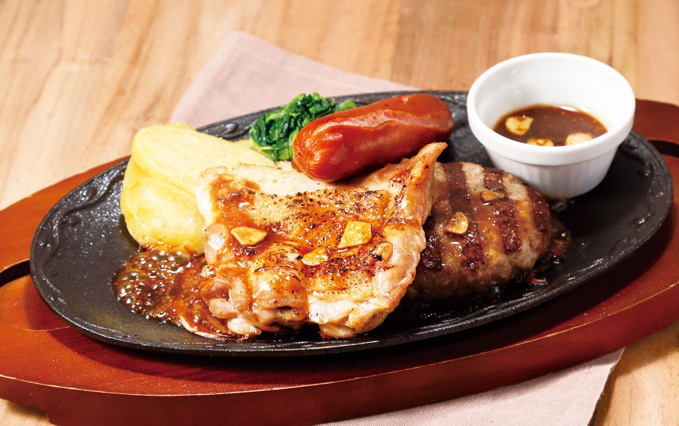 皮目を炙り香ばしさを引き出したチキングリル、ジューシーで柔らかな合挽きハンバーグ、プリッとした食感から肉汁がはじけるソーセージを盛り合わせた、“肉×肉×肉”のボリューム満点ミックスグリルです。