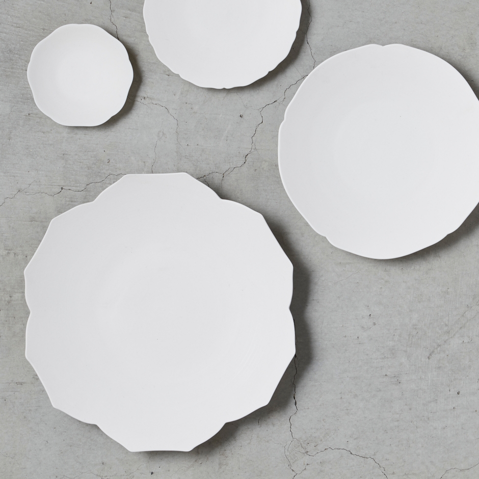 シンプルに図形化する「家紋」など古来の文様から着想を得て、花の輪郭を象った器。京都・清水焼の作家・工房の技術でつくられる繊細かつ実用的な器です。