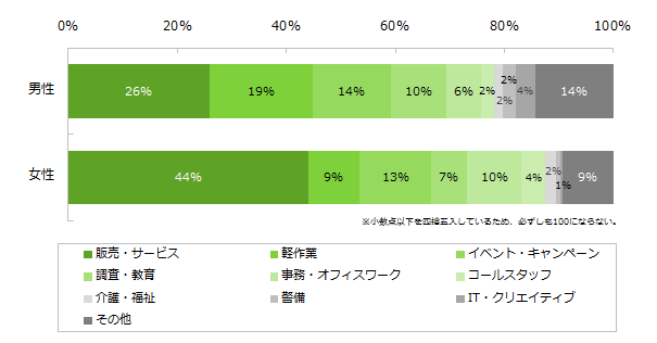 「これまでに体験して良かったアルバイトは何ですか?」と伺ったところ、第1位は男女ともに「販売・サービス」(男性:26%、女性:44%)でした。続く第2位は、男性が「軽作業」(19%)、女性が「イベント・キャンペーン」(13%)を挙げています。