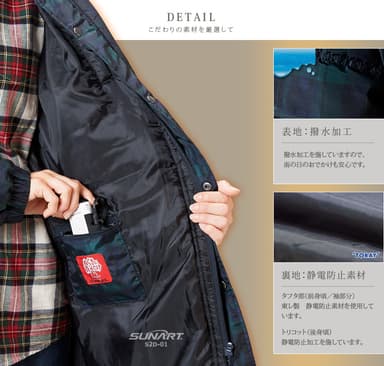 前身頃裏と袖の裏地には、東レ製 静電防止素材を使用し、背中部分にはトリコット生地を使用し着用時のひんやり感を軽減させるとともに、静電防止加工を施し、静電気の嫌なパチパチ感を抑えます。