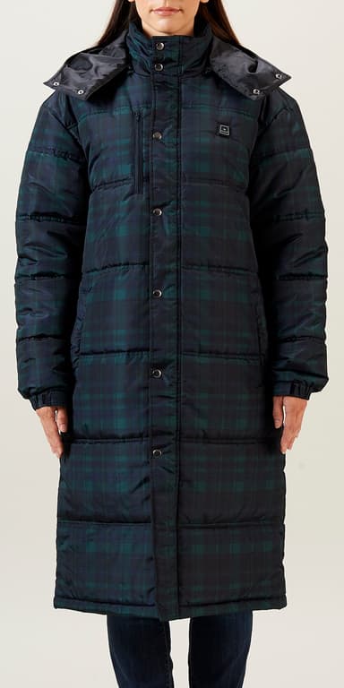 本商品は、一般的な黒や紺の単色ではなく、ベンチコートには珍しいチェック柄(ブラックウォッチ)を採用。一見、ただのおしゃれなベンチコートに見えますが、首後部と背中から腰に掛けてヒーターを内蔵することで全身をあたためます。