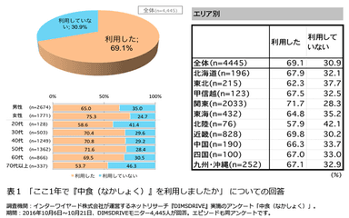 表1「ここ1年で『中食(なかしょく)』を利用しましたか」についての回答