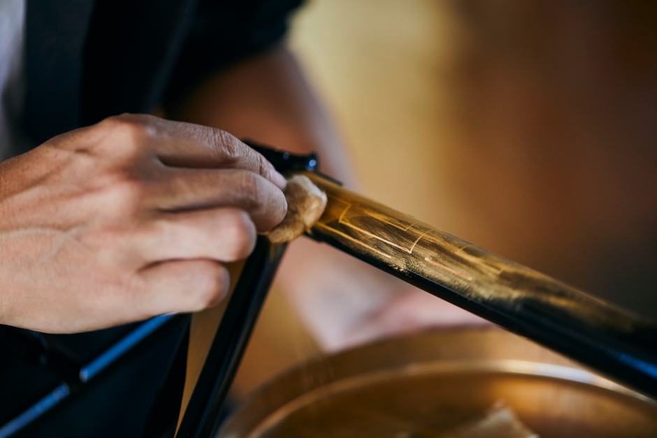 「余計なものを削ぎ落とし、本質を追求した先に生まれる機能美」日本のものづくりにおいてその哲学・美意識は、受け継がれてきました。今改めて、その感性を見つめ直すことで、ものの選び方、ものとの過ごし方が変化し、目に見えないものを大切にする生活に繋がるように。そのような想いを込めフレームビルダー 片岡聖登によって製作された自転車に、漆芸家 服部一齋の漆芸が施されました。ビゴーレで70 年代から受け継がれた設計構造を象徴した螺鈿や蒔絵のデザインは、フレームそのものの構造と一体し、自転車の線の美しさを最大限に際立たせています。