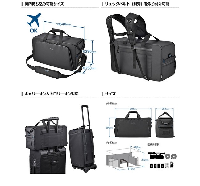 小型カムコーダーと周辺アクセサリー、または中型カムコーダーを効率的に収納できる、プロの現場での使いやすさを追求した大容量ショルダーバッグです。機内持ち込みサイズに対応する無駄のないスクエアデザインに、6面すべてに厚みのあるクッション材とボード材を内蔵した堅牢な構造が機材をしっかりと保護します。