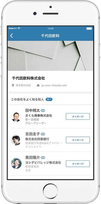ユーザーと企業の情報が可視化されることにより、各ユーザーが自身のビジネスネットワークを活用できる幅はさらに広がります。例えば、まだつながりのない企業にアプローチしたい場合、その企業のページを閲覧し、すでにつながりのある知り合いや同僚を見つけて窓口を紹介してもらう、といった活用方法も可能になります。