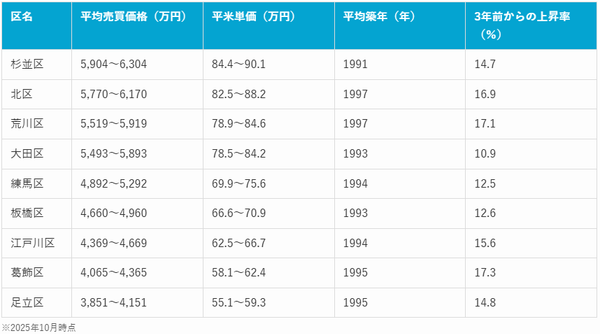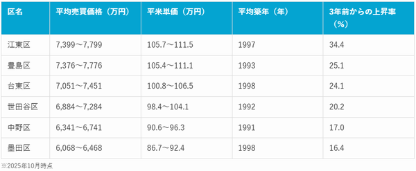 平均築年数が20年〜30年以上にもかかわらず、3年前と比較して20%超〜65%と高い上昇率で価格が推移している点も需要と人気の高さを裏付けています。