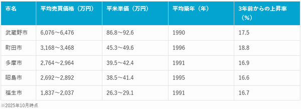 23区外エリアで平均売買価格の上昇率が高かったのは、町田市・多摩市・昭島市・武蔵野市の5市でした。