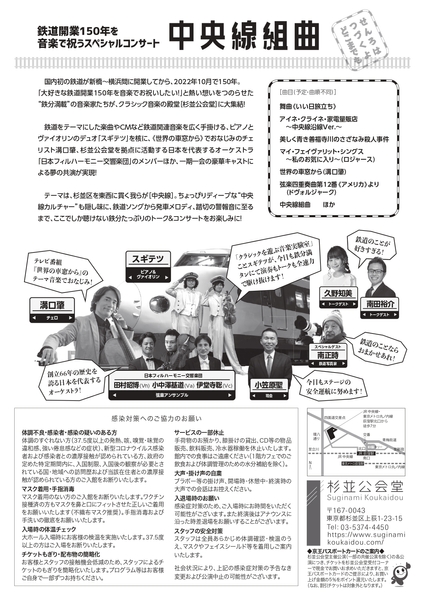 杉並公会堂[(株)京王設備サービス]主催、『中央線組曲 ~鉄道開業150年を音楽で祝うスペシャルコンサート~』が2022年10月15日 (土)に杉並公会堂 大ホール(東京都杉並区上荻1-23-15)にて開催されます。