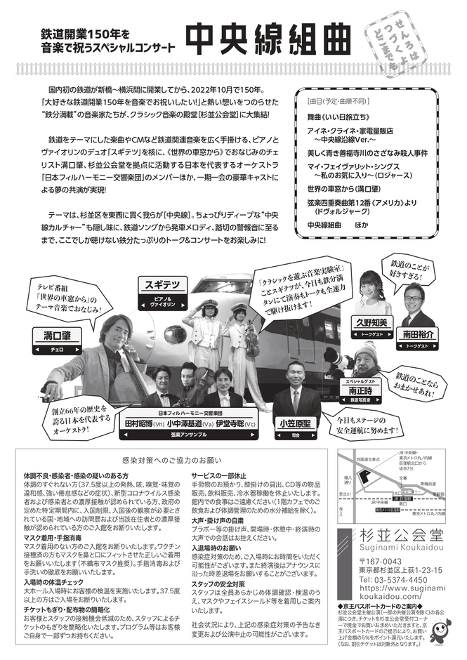 鉄道をテーマにした楽曲やCMなど鉄道関連音楽を広く手掛けるピアノとヴァイオリンのデュオ『スギテツ』のプロデュースにより、《世界の車窓から》でおなじみのチェリスト溝口肇、杉並公会堂を拠点に活動する日本を代表するオーケストラ『日本フィルハーモニー交響楽団』のメンバーなど、第一線で活躍するミュージシャンに加え、トークゲストとして久野知美(女子鉄アナウンサー)、南田裕介(ホリプロマネージャー)、スペシャルゲストとして南 正時(鉄道写真家)、小野田滋(鉄道友の会理事)が華を添えます。