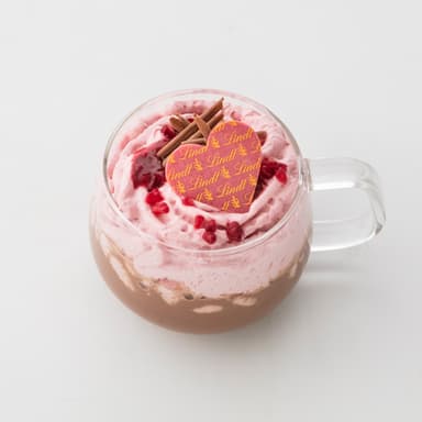 リンツの濃厚なホットチョコレートの上に、フランボワーズのフリーズドライパウダー入りのほのかに甘酸っぱいホイップクリーム、赤いフランボワーズのソース、フランボワーズのブリゼ、そしてトップにはチョコレートのコポー(ダークまたはミルク)が飾られます。