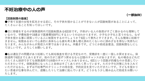 昨年も、このような実態を知ってもらうために、治療当事者の声を全国の首長へ届けました。その結果、一部の自治体では助成制度を設けたり助成が拡充されることになりました。