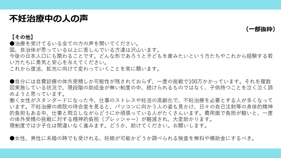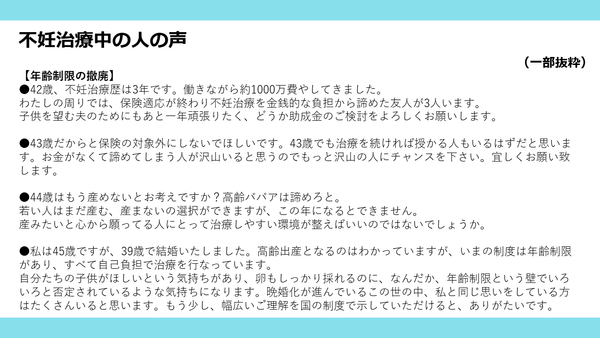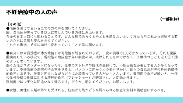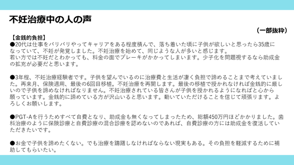 一般不妊治療の不妊検査や高度生殖医療の負担額を減らすための助成金を求める声が多く上がっています。