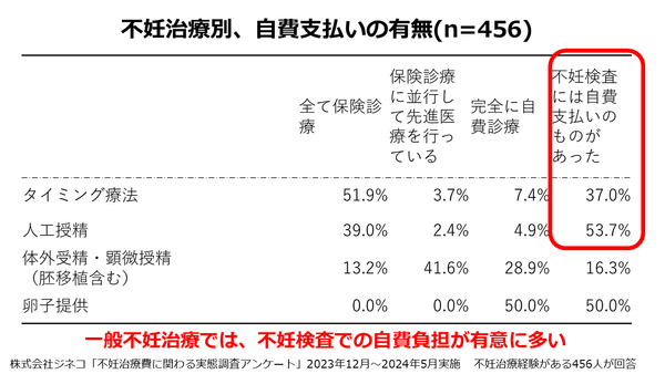 タイミング療法や人工授精などの一般的な不妊治療でも、検査段階で自費支払いが生じています。これは、保険適用内であっても追加費用が発生することが一般的であることを意味します。