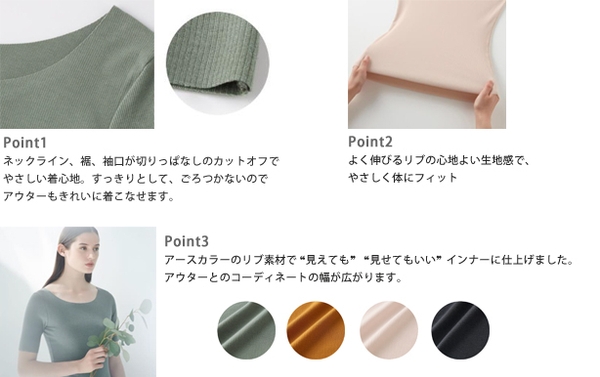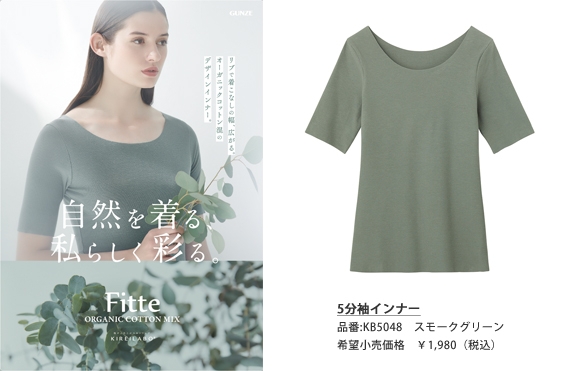 「KIREILABO Fitte」は、オーガニックコットン混素材のやさしい着心地と、自然からヒントを得たアースカラー、気分に合わせて選べる豊富なラインアップでデビュー以来多くのお客さまに支持をいただいているブランドです。この度発売した「カットオフリブ」グループは、人気のリブ素材で❝見えても❞ ❝見せてもいい❞着まわし抜群の新しいインナーの形を提案、リブの伸縮性で体にやさしくフィットしてしなやかな シルエットも実現しています。さらに、ネックライン、袖口、裾が切りっぱなしのカットオフなので、アウターにひびきにくく、ごろつかないのもうれしいポイントです。シンプルなのにリブの凹凸感がかわいいブラレットとショーツ、定番のタンクトップや8分袖に加え、アウターに多い5分袖もラインアップ。ネックラインを狭めにデザインするなど細部にもこだわりました。