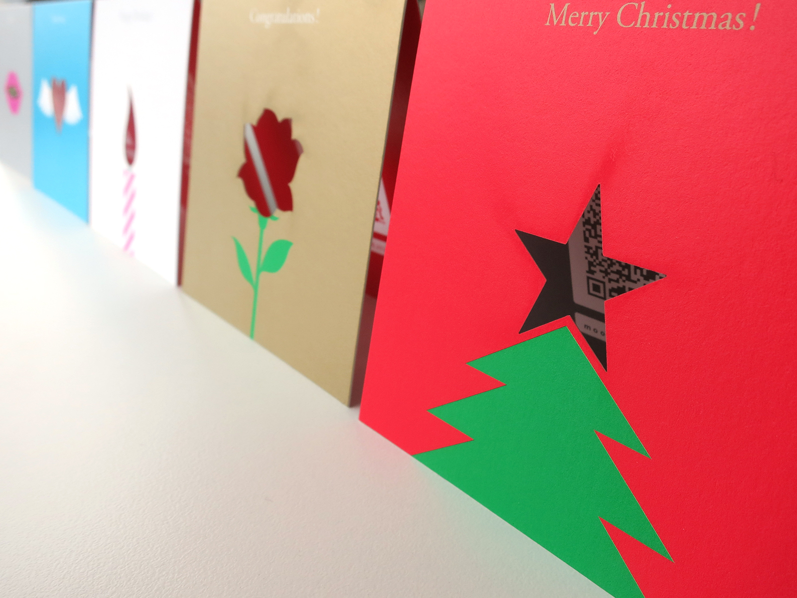 CUTOUTシリーズではカード表面のイラストに抜き加工を施し、moovinカードの特徴と言えるQRコードの一部を露出させ、その柄を活かすデザインになっております。Happy BirthdayやThank YouならびにMerry Xmasといった全6種類のテーマに応じたデザイン展開となり、また、各カードデザインに応じたオープニングムービーやフレームを動画に利用することができます。