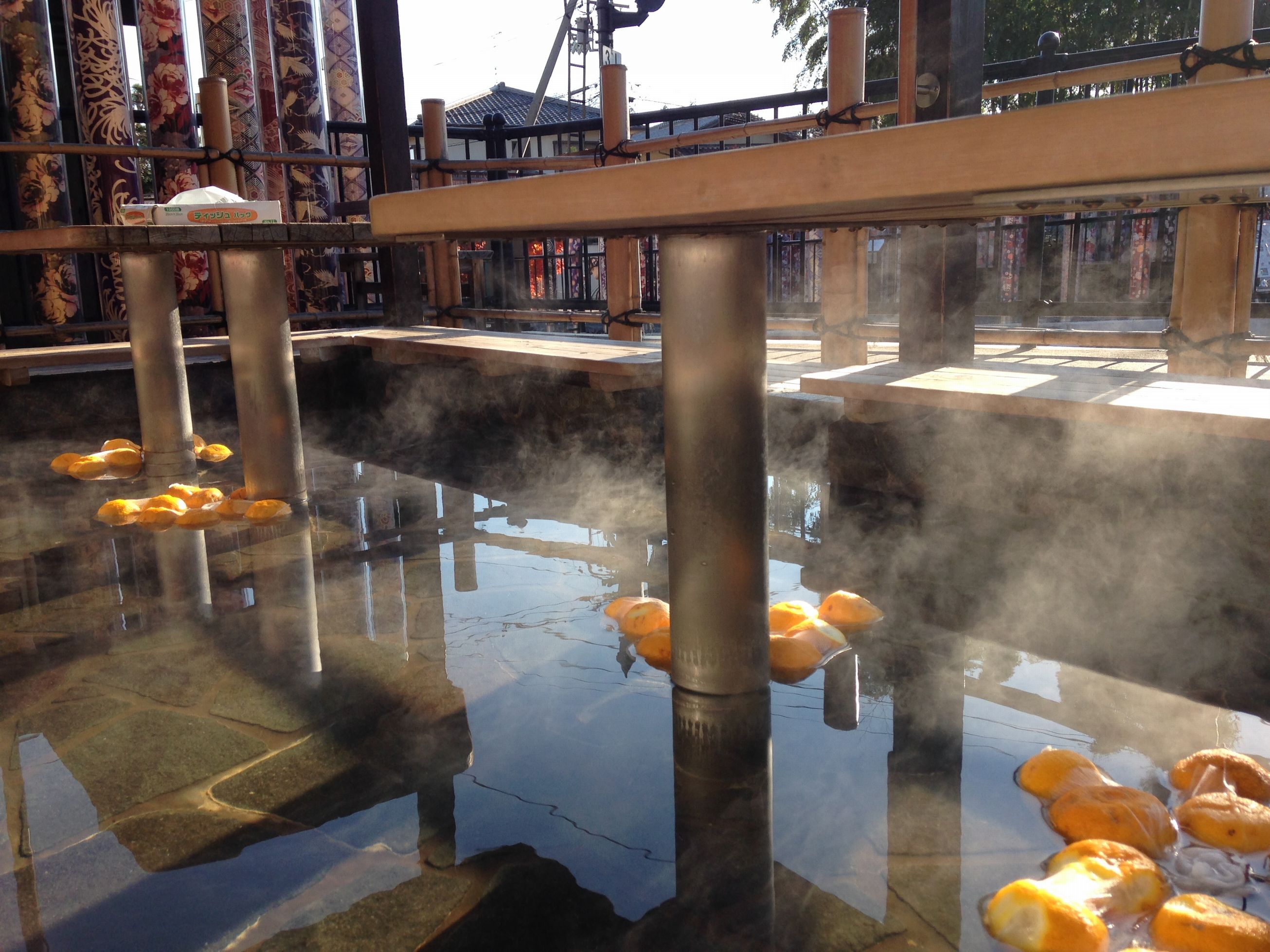 ゆず湯冬至は、一年の中で太陽の日照時間が一番短い日です。冬至は「湯治」、ゆずは「融通が利く」と言う語呂合わせから風邪予防のひとつとして古くから「ゆず湯で温まる」というならわしがあります。