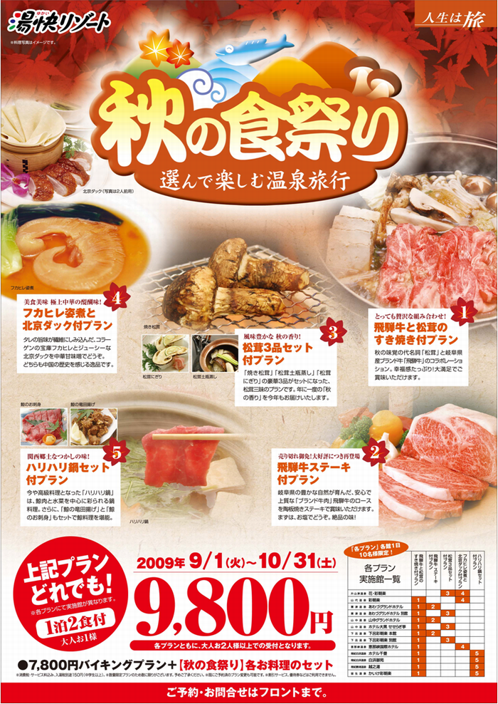 このたび、2009年9月1日よりグループ13館にて、湯快リゾート初となるグルメキャンペーン「秋の食祭り」と銘打ち、通常バイキングに下記5つのプランが付いた、“1泊2食付 9,800円”プランの販売を開始いたしますので、下記の通りお知らせいたします。